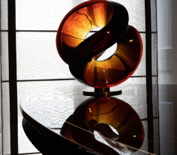 This hand-carved, African ebony dining table is overlaid with bison horn and features a silver inlay around its radius.